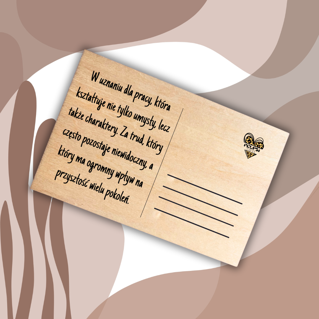 Drewniana pocztówka na Dzień Nauczyciela: dziecko z książką i kwiatami – idealne dla miłośnika literatury, nauczyciela szkół podstawowych oraz przedszkoli. Wykonana z naturalnej sklejki, co sprawia, że jest trwała, odporna na zginanie i długo zachowuje swój wyjątkowy wygląd. Każdy wzór jest niepowtarzalny i stanowi kreatywny sposób, by podziękować nauczycielowi za jego trud i zaangażowanie.