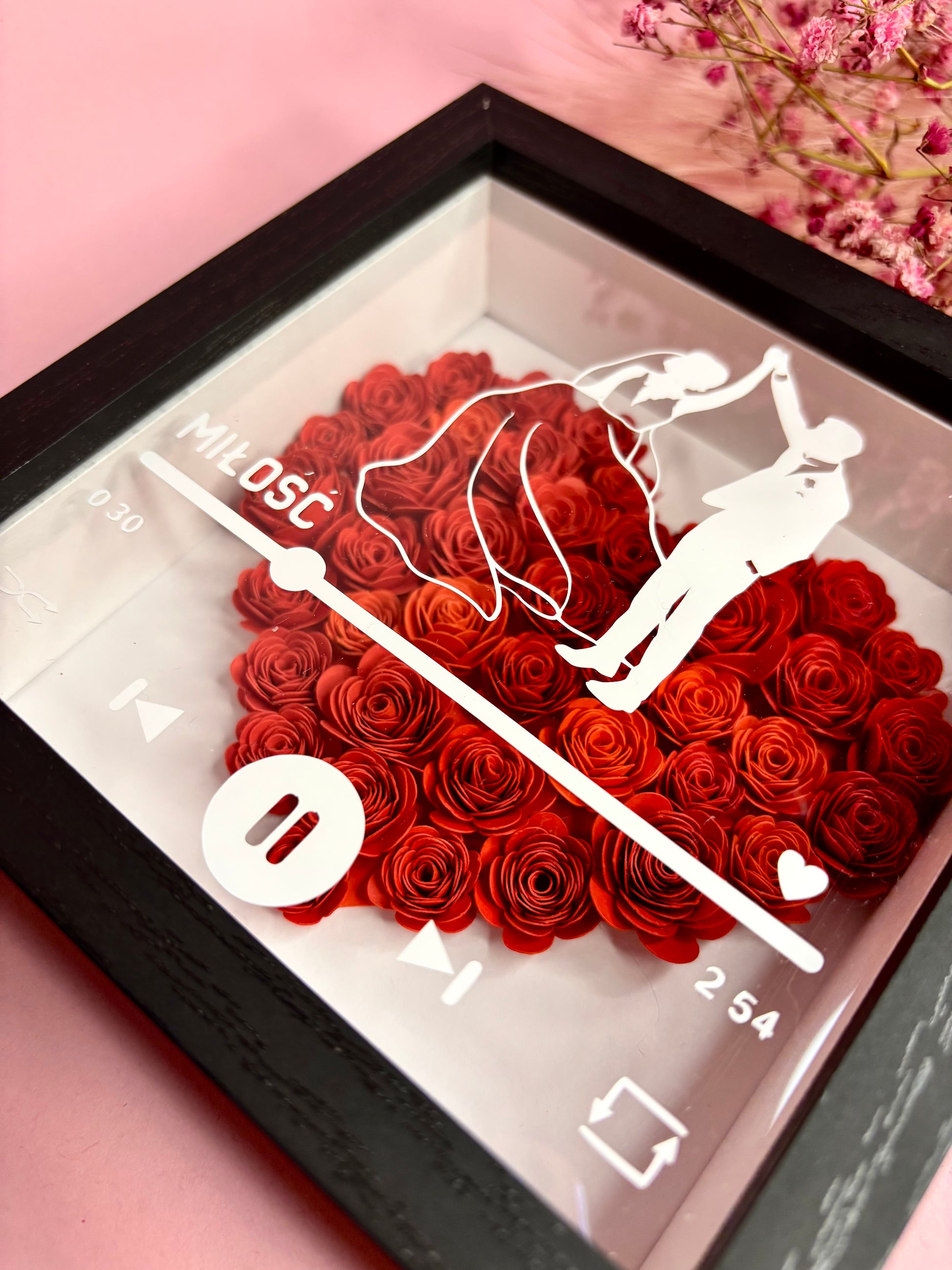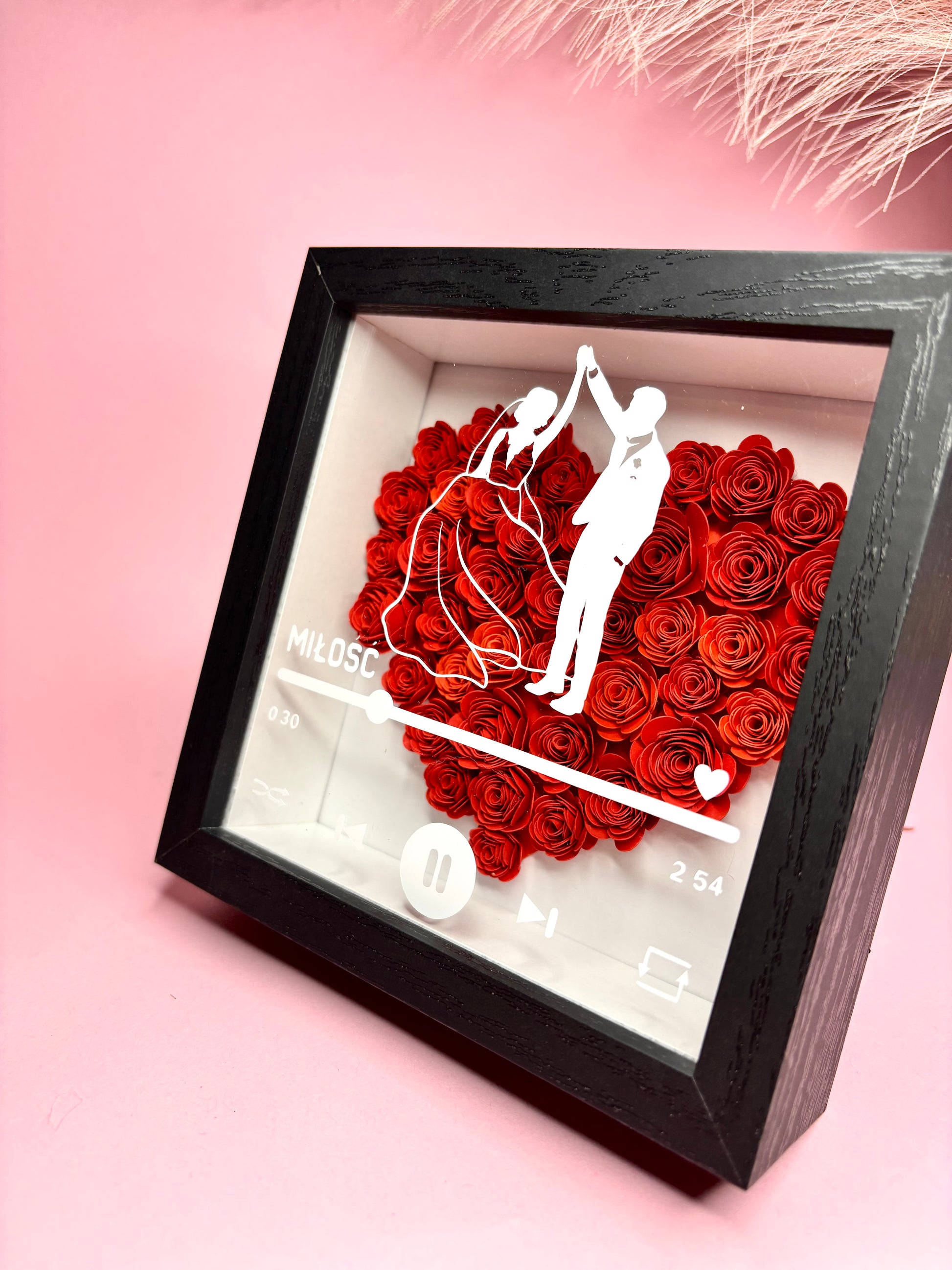 Wyjątkowy, przestrzenny obrazek 3D, który zatrzymuje magiczny moment dnia ślubu – tańczącą parę młodą przy odtwarzaczu muzyki, z czerwonym sercem w tle.