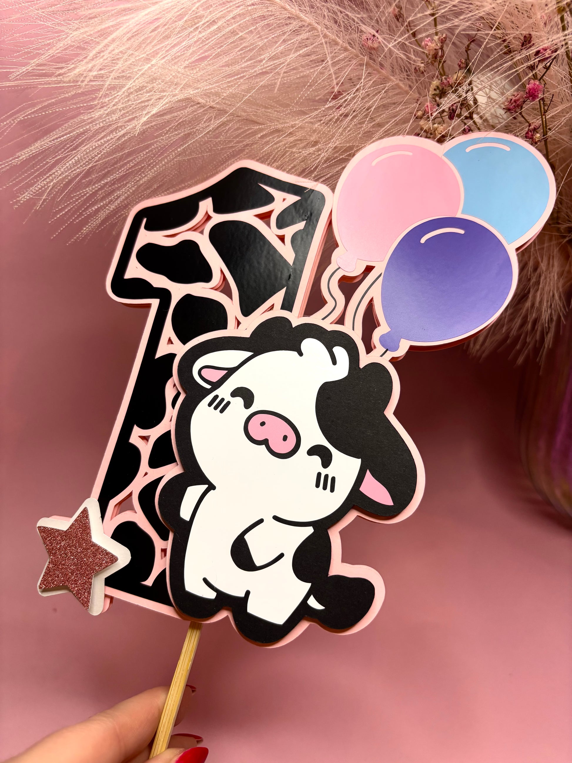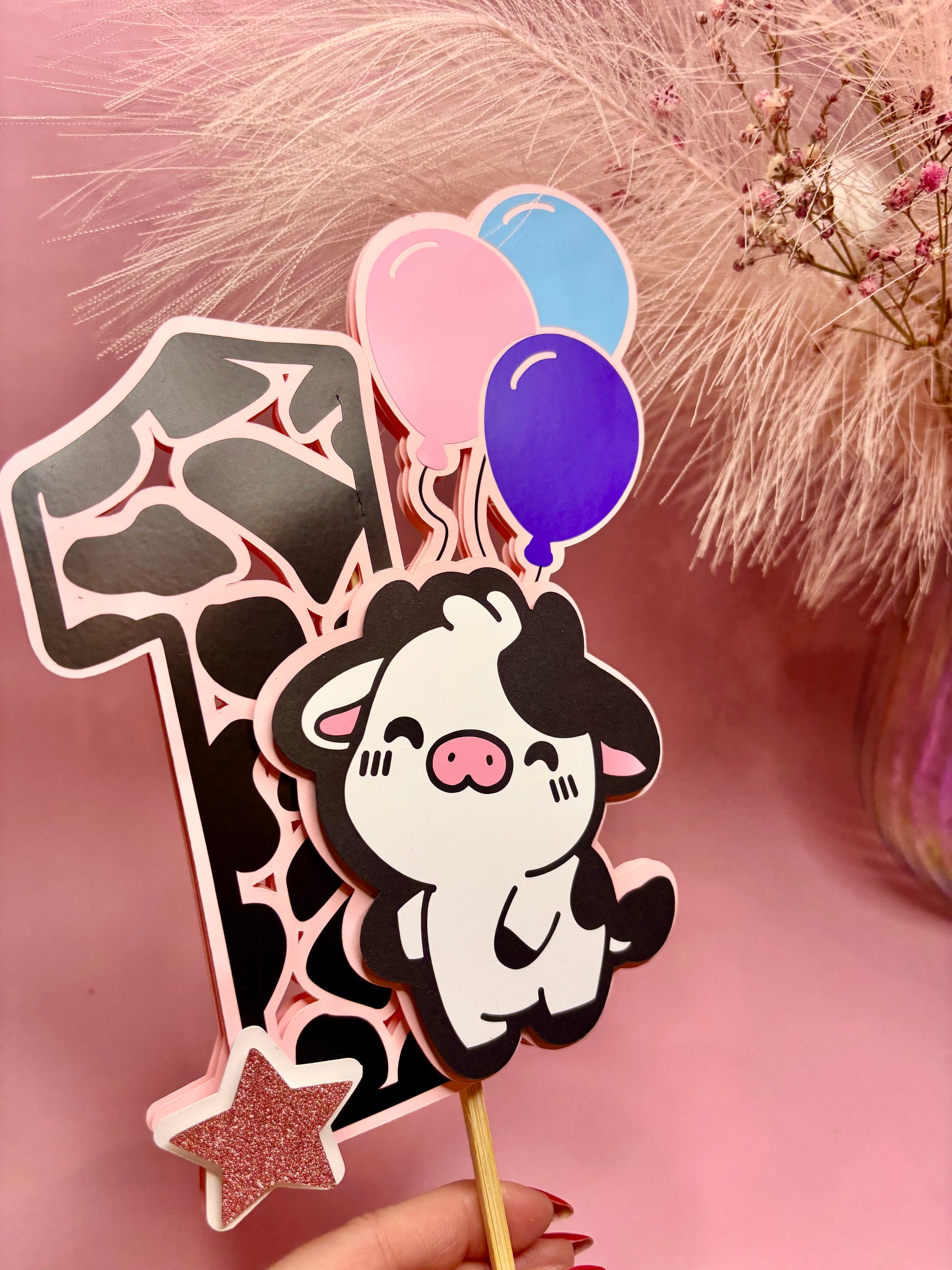 Uroczy topper 3D w kształcie krowy trzymającej baloniki – idealny na tort urodzinowy lub dekorację prezentu.