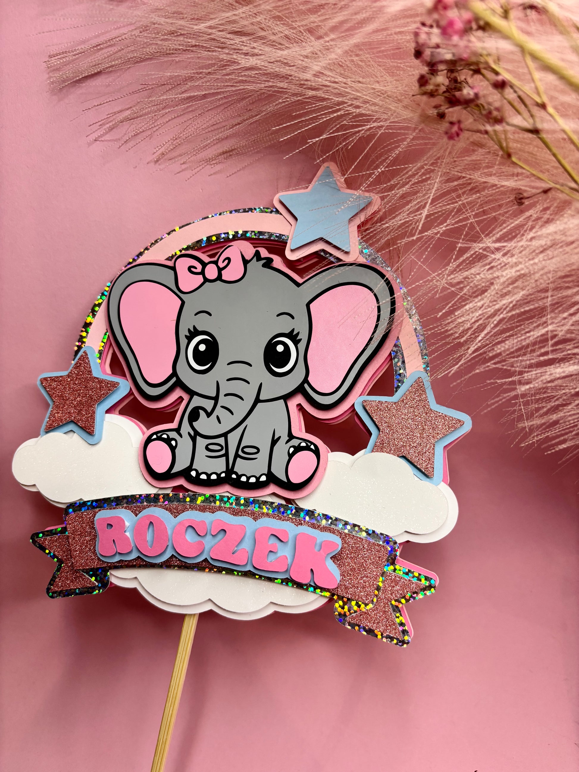 Uroczy topper 3D ze słonikiem w różowej, brokatowej odsłonie to idealna dekoracja tortu na roczek lub inne dziecięce przyjęcie.